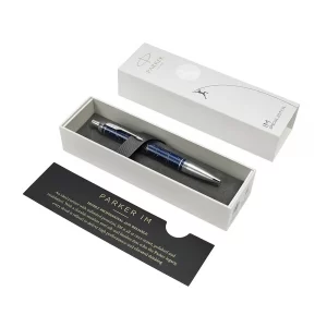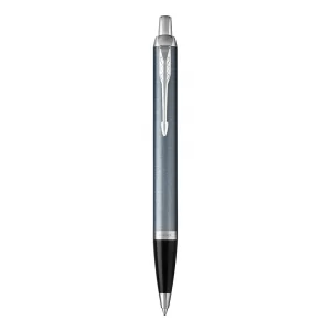 Szaro-niebieski, z chromowanymi wykończeniami Pewność i profesjonalizm. Solidny partner. Inteligentny, pewny i profesjonalny. Linia Parker IM to stalówki ze stali nierdzewnej i wykończenia oddające najlepszą tradycję marki. Każdy detal linii zaprojektowany został tak, by zapewnić niezawodność pisania. Jasny, szaro-niebieski lakier, spiralny szlif i chromowane pierścienie. W opakowaniu prezentowym Parker.