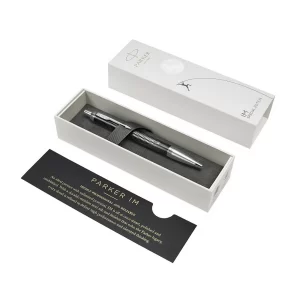 Biały, z chromowanymi wykończeniami Pewność i profesjonalizm. Solidny partner. Inteligentny, pewny i profesjonalny. Linia Parker IM to stalówki ze stali nierdzewnej i wykończenia oddające najlepszą tradycję marki. Każdy detal linii zaprojektowany został tak, by zapewnić niezawodność pisania. Błyszczący, biały lakier i chromowane pierścienie. W opakowaniu prezentowym Parker.