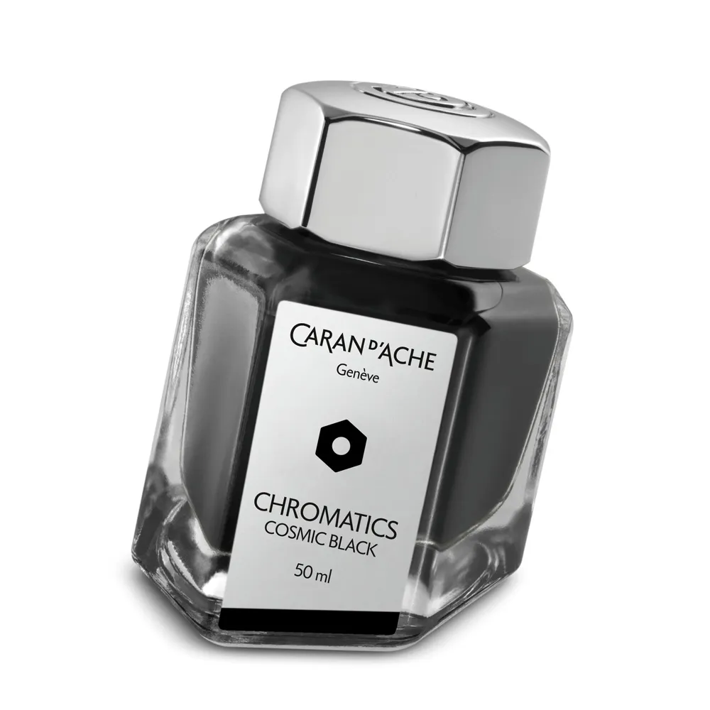 Wszystkie produkty szwajcarskiej marki, w tym atramenty są wykonane z najwyższą dbałością i mogą się pochwalić wysoką jakością. Skośna podstawa i szeroka szyjka kałamarza sprawiają, że napełnienie pióra jest dużo prostsze. Piękne, bogate i żywe kolory zachwycą niejednego konesera sztuki pisania. Niektóre z nich są rzadkie i niespotykane jak na przykład pomarańczowy, jasna zieleń, głęboka szarość.Atrament Chromatics Cosmic Black Caran d’Ache