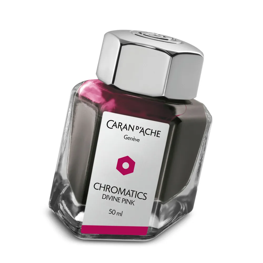 Wszystkie produkty szwajcarskiej marki, w tym atramenty są wykonane z najwyższą dbałością i mogą się pochwalić wysoką jakością. Skośna podstawa i szeroka szyjka kałamarza sprawiają, że napełnienie pióra jest dużo prostsze. Piękne, bogate i żywe kolory zachwycą niejednego konesera sztuki pisania. Niektóre z nich są rzadkie i niespotykane jak na przykład pomarańczowy, jasna zieleń, głęboka szarość.Atrament Chromatics Divine Pink Caran d’Ache