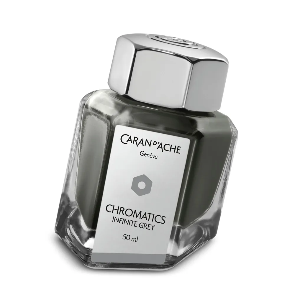 Wszystkie produkty szwajcarskiej marki, w tym atramenty są wykonane z najwyższą dbałością i mogą się pochwalić wysoką jakością. Skośna podstawa i szeroka szyjka kałamarza sprawiają, że napełnienie pióra jest dużo prostsze. Piękne, bogate i żywe kolory zachwycą niejednego konesera sztuki pisania. Niektóre z nich są rzadkie i niespotykane jak na przykład pomarańczowy, jasna zieleń, głęboka szarość.Atrament Chromatics Infinite Grey Caran d’Ache