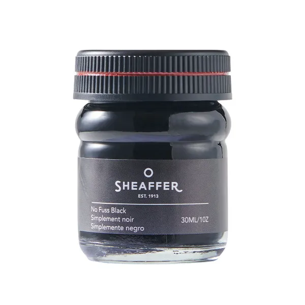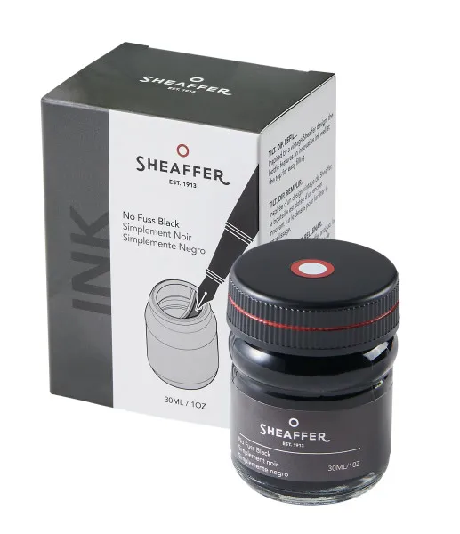 Atrament Sheaffer czarny (No Fuss Black) w kałamarzu 30 ml, z przegródką ułatwiającą pobieranie.