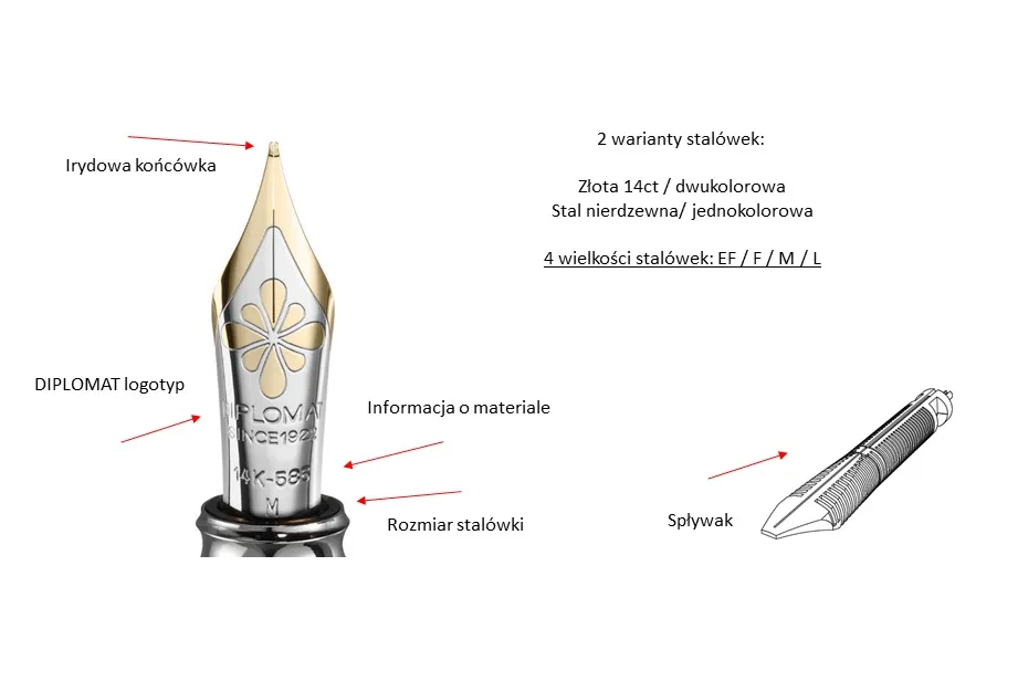 Najważniejszą częścią pióra wiecznego jest oczywiście stalówka. To ona decyduje o tym, czy pisze się bardziej twardo, miękko oraz o grubości linii pisania. Stalówka zbudowana jest najczęściej ze stali szlachetnej, palladu, tytanu lub ze złota, w droższych i bardziej ekskluzywnych modelach. Najczęściej jest to 14 lub 18 karatowe złoto o próbie 750 lub 800. Bywają również ręcznie polerowane – takie znajdziemy na przykład w ofercie marki Diplomat. Stalówka zakończona jest specjalną odporną na ścieranie końcówką z irydu lub rutenu. Dzięki plastikowemu spływakowi atrament dostaje się do stalówki.