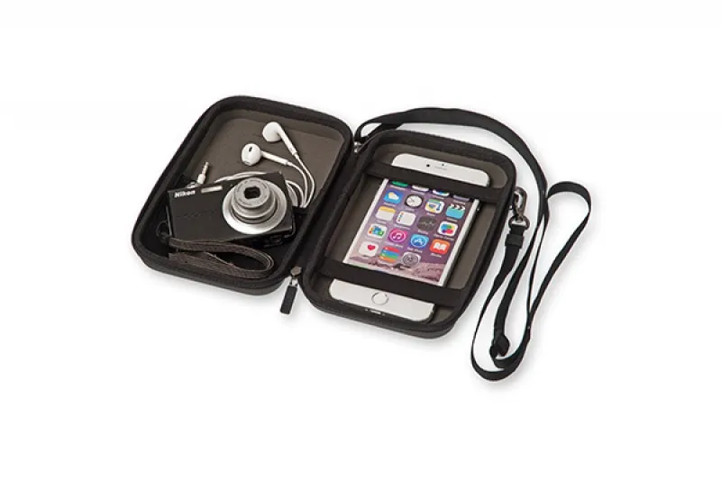 Świetnie nadaje się do przechowywania i ochrony małych urządzeń, akcesoriów cyfrowych i innych luźnych przedmiotów. Można go również nosić na ramieniu z odpinanym paskiem na te chwile, gdy musisz mieć wolne ręce. Cechy zewnętrzne: szara zamszowa podszewka, zapięcie na zamek, wodoodporne. Cechy wewnętrzne: 1 kieszeń z siatki, 1 elastyczny pierścień do wykorzystania jako uchwyt na długopis, 2 poziome paski do mocowania różnych przedmiotów, odpinany pasek na nadgarstek z metalowym karabińczykiem Wymiary: 4,5 x 7 x 1,75
