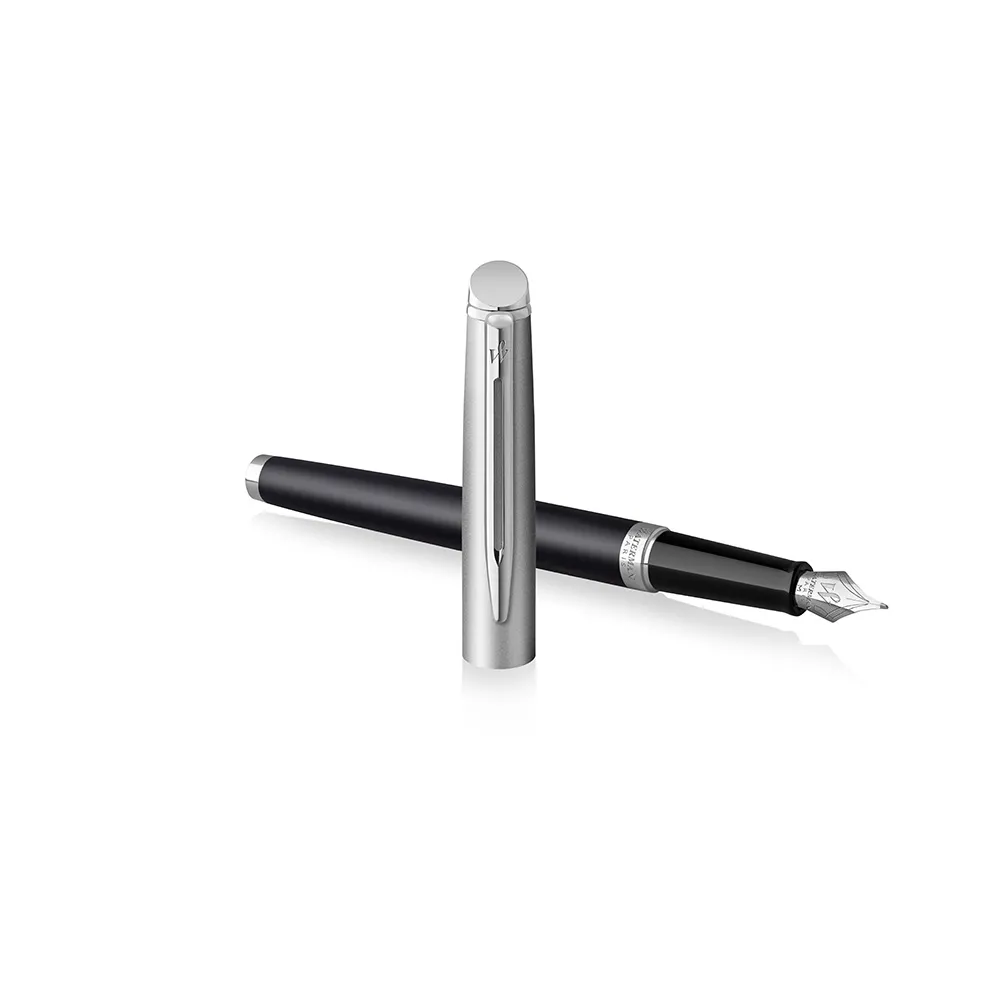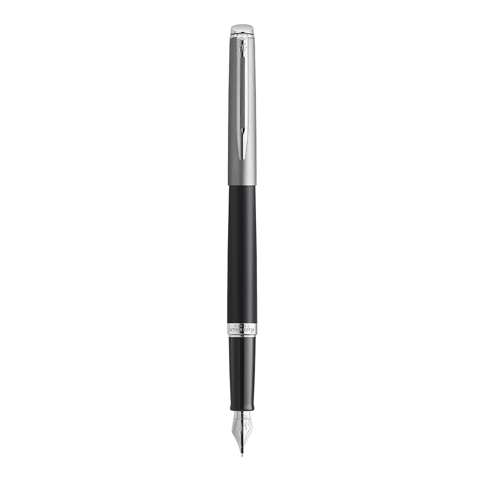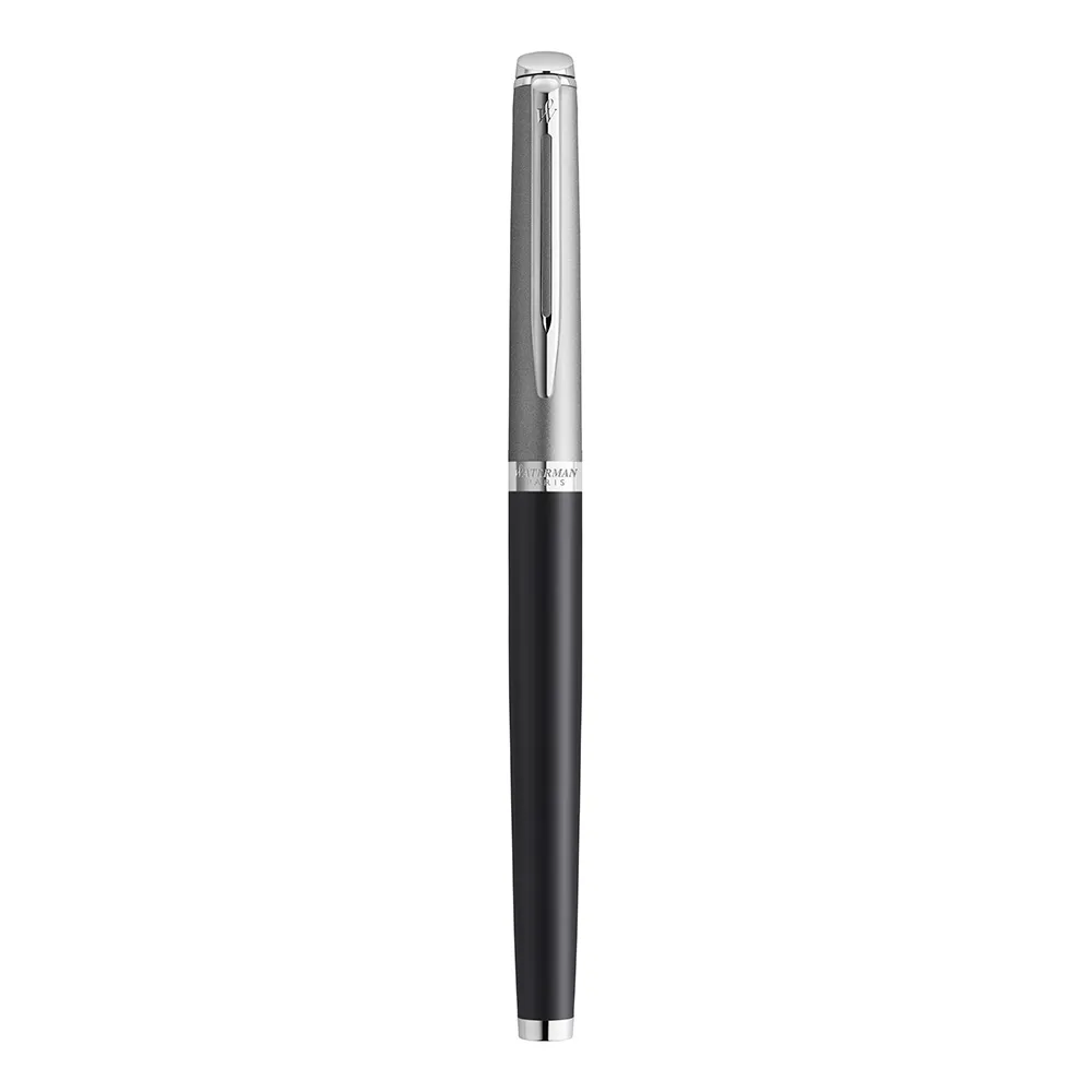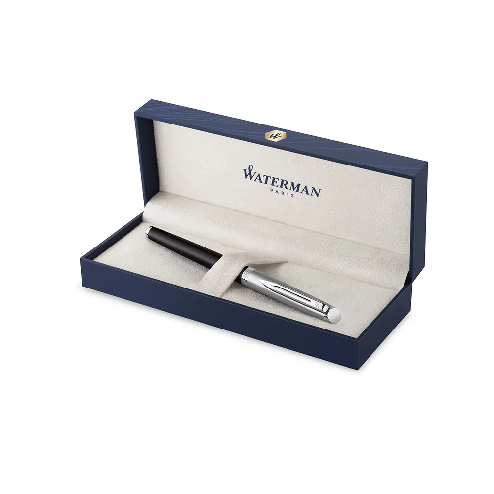 Waterman Hémisphère pióro wieczne, stal szlachetna i matowy czarny lakier z chromowanym wykończeniem, stalówka medium z nabojem z atramentem w kolorze niebieskim, pudełko upominkowe. Wyróżniające się dynamicznym, opływowym i eleganckim kształtem pióro Waterman Hémisphère oferuje idealną równowagę pomiędzy komfortem lekkiego narzędzia do pisania a jego stylem. Wykonana ze stali szlachetnej nasadka o współczesnej estetyce oraz lakierowany korpus w matowym czarnym kolorze podkreślony wykończeniem z palladu. Precyzyjnie wykonana stalówka o gładkiej powierzchni i spójnej formie z wygrawerowanym kultowym emblematem marki Waterman. Starannie wykonane we Francji, aby wynieść Twój niepowtarzalny styl na wyższy poziom. Oferowane w luksusowym, ciemnoniebieskim pudełku upominkowym Waterman. Przyciągające wzrok dynamicznym, opływowym i eleganckim kształtem pióro wieczne Waterman Hémisphère oferuje idealną równowagę pomiędzy komfortem lekkiego przyboru do pisania a jego stylem, które pozwolą wyróżnić Twoje pismo. Każde pióro wieczne zostało kunsztownie zaprojektowane z zastosowaniem żywej kolorystyki, pięknych lakierów i modnych wzorów inspirowanych imponującym paryskim stylem. Precyzyjnie ukształtowaną stalówkę o gładkiej powierzchni i spójnej formie charakteryzuje staranność wykonania, która pozwoli Ci przelewać na papier Twą osobowość przy każdym pociągnięciu pióra. Prawdziwie luksusowy model, oferowany w eleganckim pudełku upominkowym Waterman.