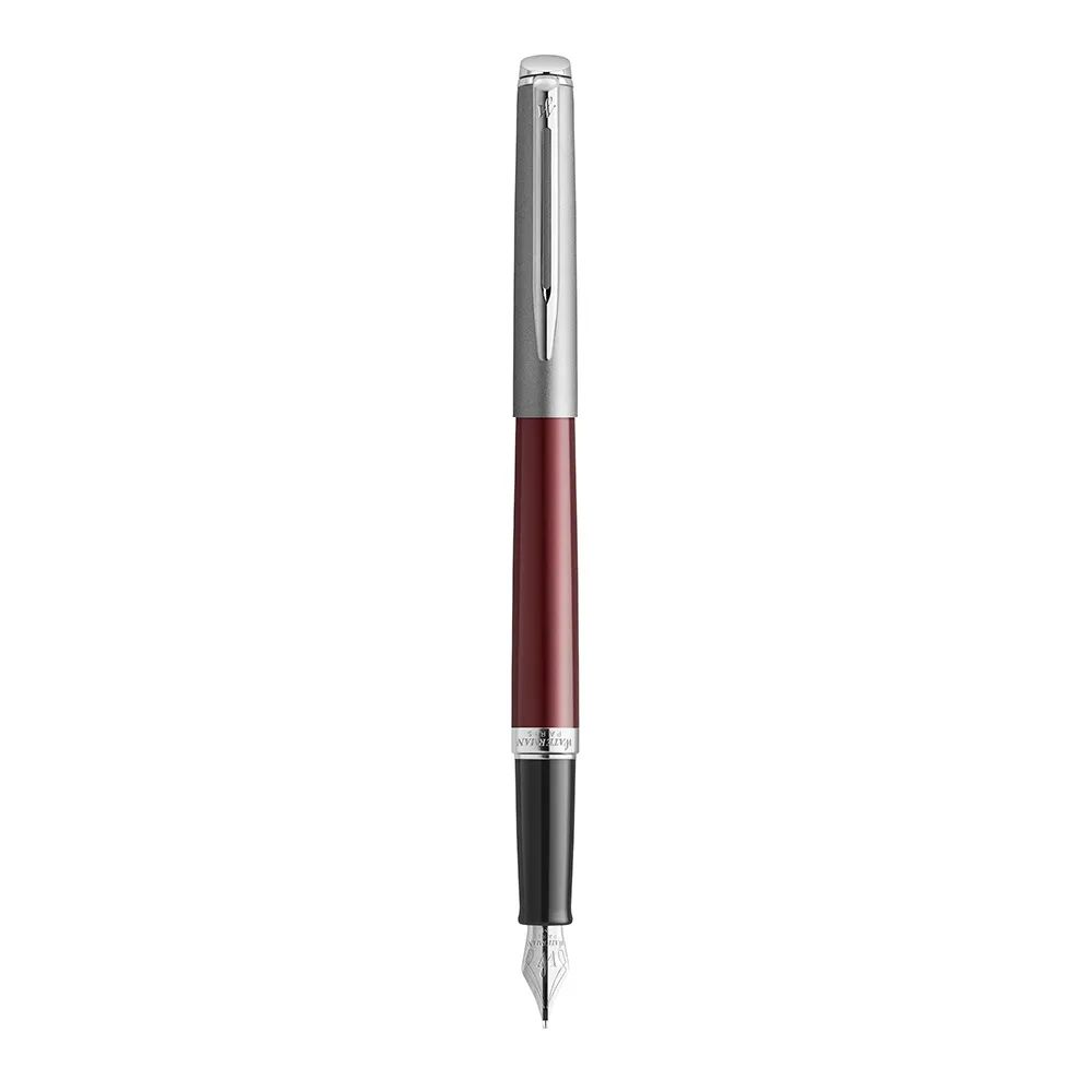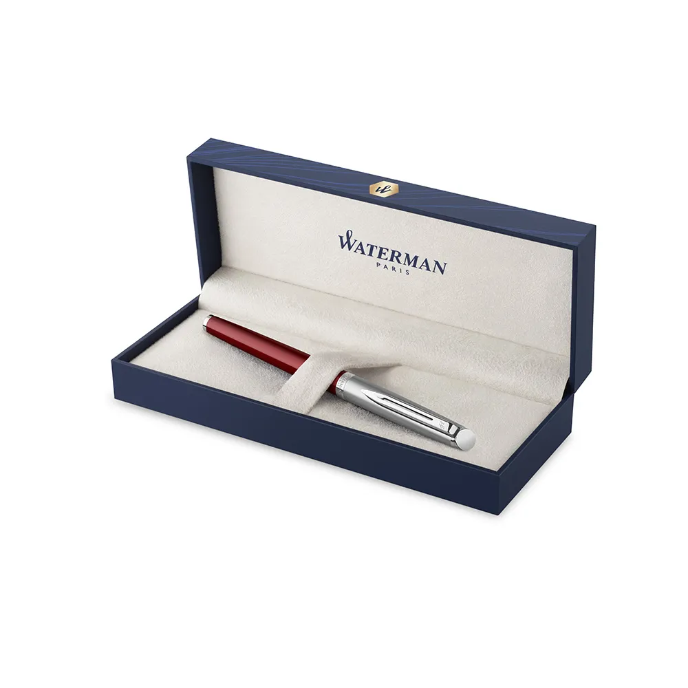 Waterman Hémisphère pióro wieczne, stal szlachetna i matowy czerwony lakier z chromowanym wykończeniem, stalówka medium z nabojem z atramentem w kolorze niebieskim, pudełko upominkowe. Wyróżniające się dynamicznym, opływowym i eleganckim kształtem pióro Waterman Hémisphère oferuje idealną równowagę pomiędzy komfortem lekkiego narzędzia do pisania a jego stylem. Wykonana ze stali szlachetnej nasadka o współczesnej estetyce oraz lakierowany korpus w matowym czerwonym kolorze podkreślony wykończeniem z palladu. Precyzyjnie wykonana stalówka o gładkiej powierzchni i spójnej formie z wygrawerowanym kultowym emblematem marki Waterman. Starannie wykonane we Francji, aby wynieść Twój niepowtarzalny styl na wyższy poziom. Oferowane w luksusowym, ciemnoniebieskim pudełku upominkowym Waterman. Przyciągające wzrok dynamicznym, opływowym i eleganckim kształtem pióro wieczne Waterman Hémisphère oferuje idealną równowagę pomiędzy komfortem lekkiego przyboru do pisania a jego stylem, które pozwolą wyróżnić Twoje pismo. Każde pióro wieczne zostało kunsztownie zaprojektowane z zastosowaniem żywej kolorystyki, pięknych lakierów i modnych wzorów inspirowanych imponującym paryskim stylem. Precyzyjnie ukształtowaną stalówkę o gładkiej powierzchni i spójnej formie charakteryzuje staranność wykonania, która pozwoli Ci przelewać na papier Twą osobowość przy każdym pociągnięciu pióra. Prawdziwie luksusowy model, oferowany w eleganckim pudełku upominkowym Waterman.