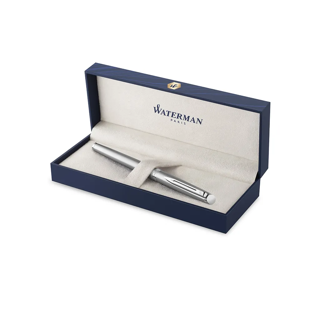 Waterman Hémisphère pióro wieczne, stal szlachetna z chromowanym wykończeniem, stalówka medium z nabojem z atramentem w kolorze niebieskim, pudełko upominkowe. Wyróżniające się dynamicznym, opływowym i eleganckim kształtem pióro Waterman Hémisphère oferuje idealną równowagę pomiędzy komfortem lekkiego narzędzia do pisania a jego stylem. Wykonana ze stali szlachetnej nasadka o współczesnej estetyce oraz korpus podkreślony wykończeniem z palladu. Precyzyjnie wykonana stalówka o gładkiej powierzchni i spójnej formie z wygrawerowanym kultowym emblematem marki Waterman. Starannie wykonane we Francji, aby wynieść Twój niepowtarzalny styl na wyższy poziom. Oferowane w luksusowym, ciemnoniebieskim pudełku upominkowym Waterman. Przyciągające wzrok dynamicznym, opływowym i eleganckim kształtem pióro wieczne Waterman Hémisphère oferuje idealną równowagę pomiędzy komfortem lekkiego przyboru do pisania a jego stylem, które pozwolą wyróżnić Twoje pismo. Każde pióro wieczne zostało kunsztownie zaprojektowane z zastosowaniem żywej kolorystyki, pięknych lakierów i modnych wzorów inspirowanych imponującym paryskim stylem. Precyzyjnie ukształtowaną stalówkę o gładkiej powierzchni i spójnej formie charakteryzuje staranność wykonania, która pozwoli Ci przelewać na papier Twą osobowość przy każdym pociągnięciu pióra. Prawdziwie luksusowy model, oferowany w eleganckim pudełku upominkowym Waterman.
