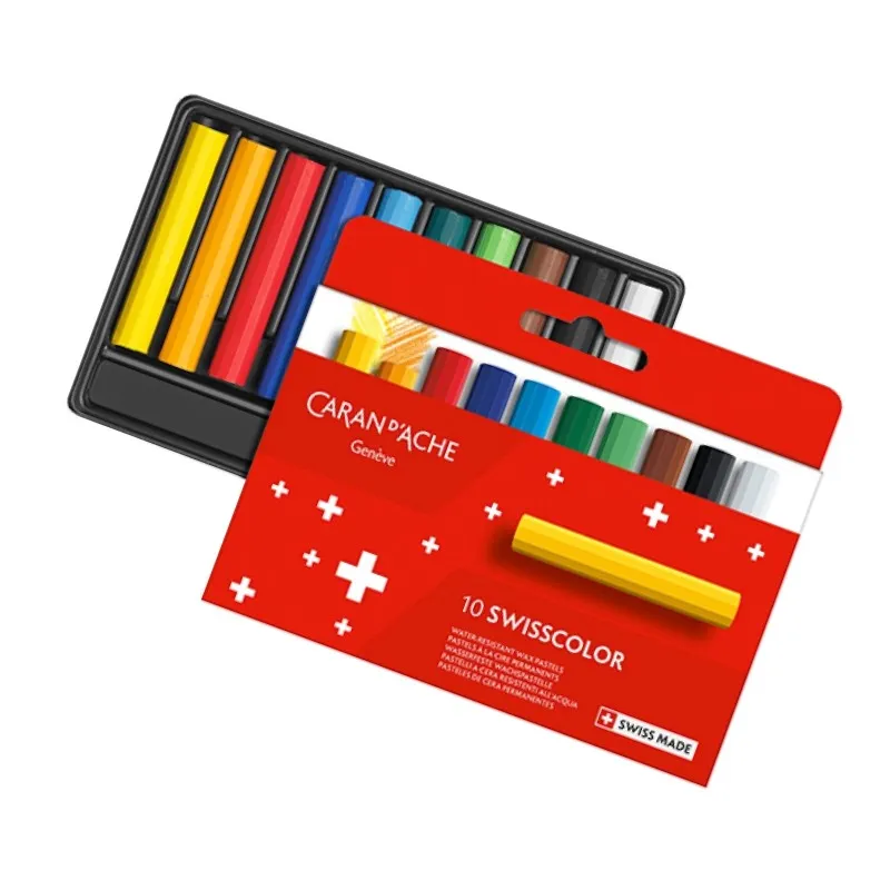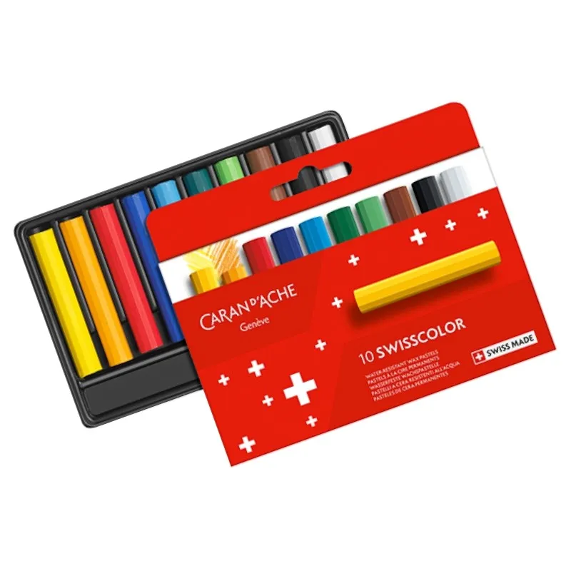 Kredki woskowe CARAN D'ACHE Swisscolor, kartonowe pudełko, 10 szt. Kredki woskowe z kolekcji Swisscolor wyróżniają się wyjątkowym projektem opakowania, intensywne czerwone pudełko ozdobione jest białymi krzyżami - szwajcarskim godłem.
