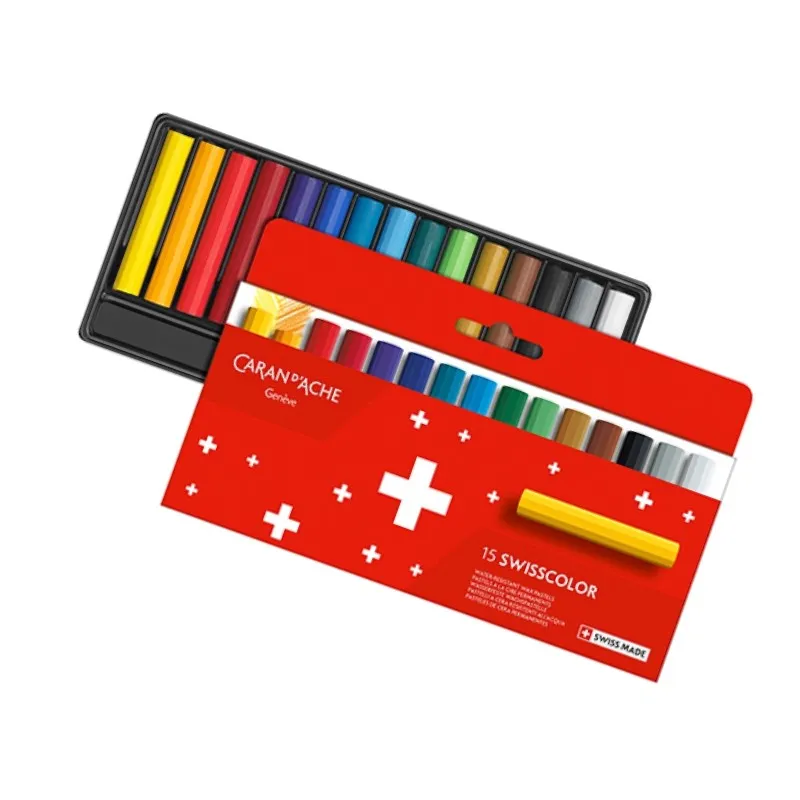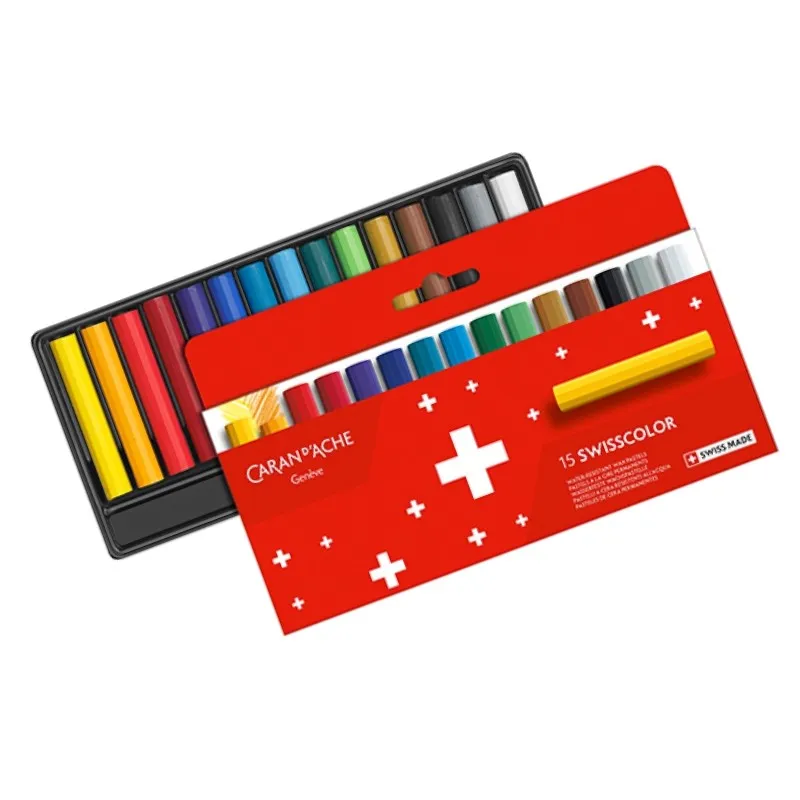 Kredki woskowe CARAN D'ACHE Swisscolor, kartonowe pudełko, 15 szt. Kredki woskowe z kolekcji Swisscolor wyróżniają się wyjątkowym projektem opakowania, intensywne czerwone pudełko ozdobione jest białymi krzyżami - szwajcarskim godłem. Kolorowe, woskowe kredki Swisscolor zostały starannie wyprodukowane przez rzemieślników z Caran d’Ache w warsztacie w Genewie, niosą sekret stuletniego know-how łączącego jakość i autentyczność.
