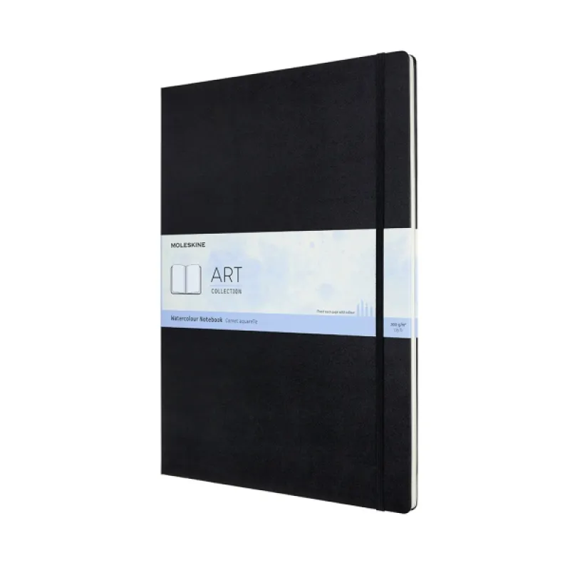 Notes Art Watercolour Moleskine A3 (29,7x42cm), czarny, 60 stron NOTATNIK Pomaluj każdą stronę kolorem FUNKCJE twarda okładka, zaokrąglone rogi, elastyczne zamknięcie rozszerzalna kieszeń wewnętrzna z tektury i tkaniny 200 g/m² papier akwarelowy 135 lb (prasowany na zimno, w 25% z włóknami bawełnianym), papier akwarelowy, który wytrzymuje ścieranie gumki i poradzi sobie z dużymi ilościami wody z obu stron kartki. Idealny do akwareli ROZMIAR A3 60 stron 29,7 × 42 cm