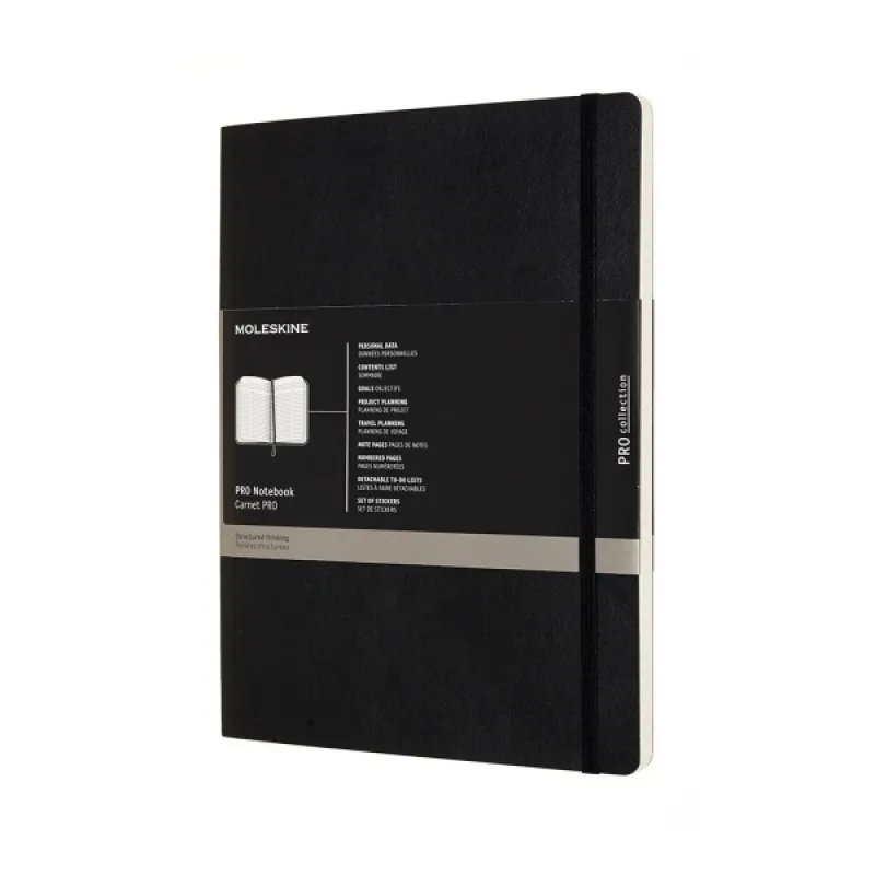 Notes Moleskine PROFESSIONAL XL (19x25 cm), czarna miękka oprawa, 192 strony NOTATNIKI PRO Uporządkowane myślenie, każdy profesjonalista powinien być produktywny w pracy i ruchu. FUNKCJE miękka okładka zaokrąglone narożniki, elastyczne zamknięcie zakładka wstążka podwójna kieszeń wewnętrzna z tektury i tkaniny papier bezkwasowy o barwie kości słoniowej 70 g/m2 ostatnie 8 arkuszy z perforacją wyrywanych elastyczne gumka i zakładka wstążkowa pasująca do koloru okładki Układ wewnętrzny: spis treści do wypełnienia strony wprowadzające do notatek na temat kluczowych zadań, projektów, cele numerowane strony notatek z obszarami na nazwy, agendę/ szczegółowe notatki, kluczowe tematy/punkty działania, kolejne kroki; ostatnie strony (nienumerowane) z możliwością wyrwania odłączane listy rzeczy do zrobienia 2 arkusze tematycznych naklejek ROZMIAR XL 192 strony 19 × 25 cm