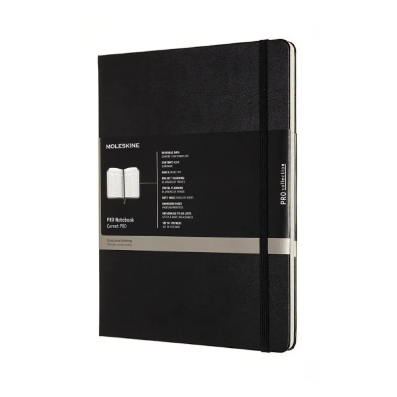 Notes Moleskine PROFESSIONAL XL (19x25 cm), czarna twarda oprawa, 192 strony NOTATNIKI PRO Uporządkowane myślenie, każdy profesjonalista powinien być produktywny w pracy i ruchu. FUNKCJE twarda okładka zaokrąglone narożniki, elastyczne zamknięcie zakładka wstążka podwójna kieszeń wewnętrzna z tektury i tkaniny papier bezkwasowy o barwie kości słoniowej 70 g/m2 ostatnie 8 arkuszy z perforacją wyrywanych elastyczne gumka i zakładka wstążkowa pasująca do koloru okładki Układ wewnętrzny: spis treści do wypełnienia strony wprowadzające do notatek na temat kluczowych zadań, projektów, cele numerowane strony notatek z obszarami na nazwy, agendę/ szczegółowe notatki, kluczowe tematy/punkty działania, kolejne kroki; ostatnie strony (nienumerowane) z możliwością wyrwania odłączane listy rzeczy do zrobienia 2 arkusze tematycznych naklejek ROZMIAR XL 192 strony 19 × 25 cm