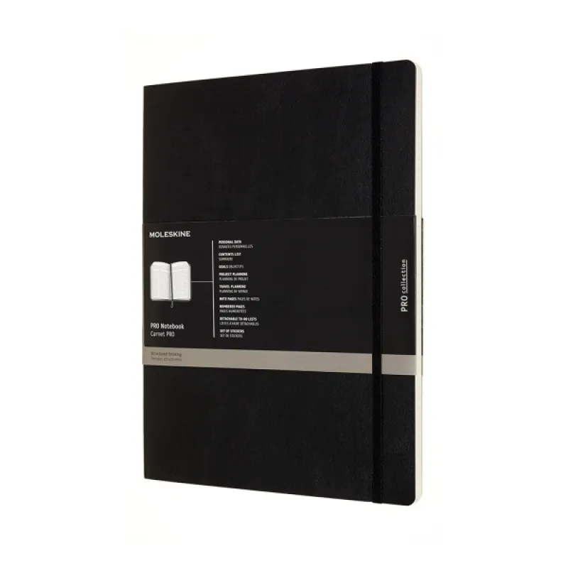 Notes Moleskine PROFESSIONAL XXL (21,6x27,9 cm), czarna miękka oprawa, 192 strony NOTATNIKI PRO Uporządkowane myślenie, każdy profesjonalista powinien być produktywny w pracy i ruchu. FUNKCJE miękka okładka zaokrąglone narożniki, elastyczne zamknięcie zakładka wstążka podwójna kieszeń wewnętrzna z tektury i tkaniny papier bezkwasowy o barwie kości słoniowej 70 g/m2 ostatnie 8 arkuszy z perforacją wyrywanych elastyczne gumka i zakładka wstążkowa pasująca do koloru okładki Układ wewnętrzny: spis treści do wypełnienia strony wprowadzające do notatek na temat kluczowych zadań, projektów, cele numerowane strony notatek z obszarami na nazwy, agendę/ szczegółowe notatki, kluczowe tematy/punkty działania, kolejne kroki; ostatnie strony (nienumerowane) z możliwością wyrwania odłączane listy rzeczy do zrobienia 2 arkusze tematycznych naklejek ROZMIAR XXL 192 strony 21,59 × 27,94 cm