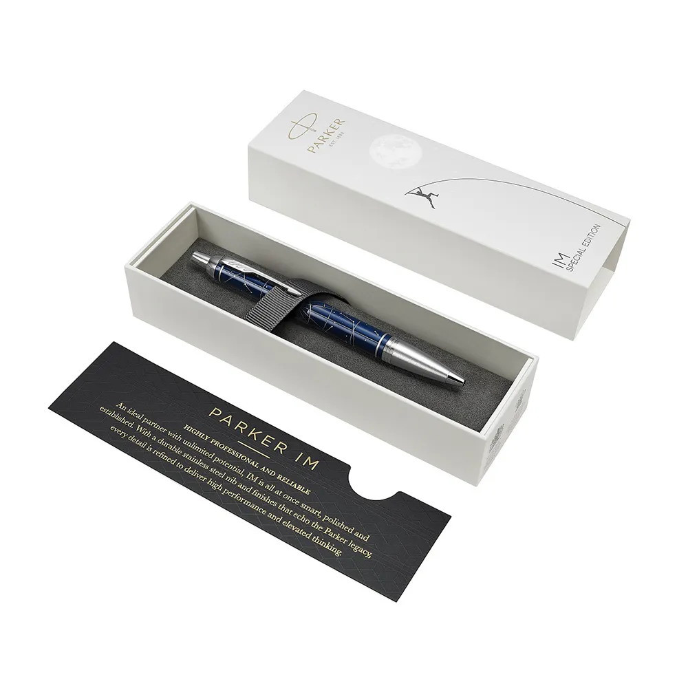 Edycja specjalna Parker IM 2018 to hołd składany najśmielszym marzeniom i nieograniczonej ambicji. Ta pieczołowicie wykonana kolekcja niezmiennie przypomina, że tam, gdzie istnieje odwaga, by sięgać gwiazd, nie ma rzeczy niemożliwych. Każde z czterech piór wykończone jest zgodnie z wysokim standardem symbolizującym doświadczenie i kunszt marki Parker, a także wyposażone jest w klip ozdobiony rozpoznawalnym znakiem strzały. Wyraźny i śmiały design każdego pióra, w czterech rozdziałach opowiada historię pasji, ambicji, rozwoju i dążenia do celu. Edycja specjalna IM czerpie inspirację z pokolenia, którego dążeniem jest zdefiniowanie standardów na nowo i wyjście poza oczekiwania. Napisz swoje przeznaczenie. Kieruj własnym losem. Długopis Midnight Astral z Edycji specjalnej IM inspirowany jest wszechświatem mieszczącym się w dłoni. Zarówno skuwka jak i korpus ozdobione mapą gwiazdozbioru prowadzą nas w podróż, której celem jest wywarcie pozytywnego wpływu na świecie. Wpływu, którym niczym gwiazdy, będzie przyświeccał celowi naszego życia. Długopis ze stali nierdzewnej z korpusem pokrytym niebieskim lakierem oraz klipem zdobionym rozpoznawalnym znakiem strzały wykonane zostało zgodnie z wysokim standardem, symbolizującym doświadczenie i kunszt marki Parker. Długopis wyposażony w klikany system wysuwania wkładu. Długopis Midnight Astral z Edycji specjalnej IM pomaga odnaleźć cel w życiu. Do długopisu pasują wkłady Parker quink flow oraz żelowe.