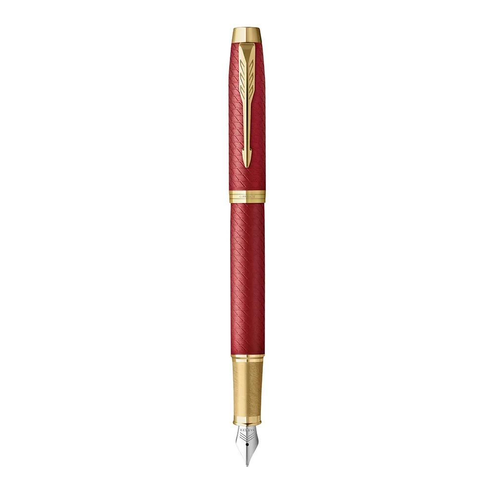 Eleganckie, dopracowane i sprawdzone wzornictwo zestawione z nowoczesną, stożkową formą . Korpus i nasadka pokryte efektownym, matowym lakierem w kolorze czerwonym z nowoczesnym grawerowaniem w linie i ze złotym wykończeniem, uzupełnione klipsem w kształcie strzałki PARKER. Trwała stalówka medium ze stali szlachetnej, która gwarantuje niezawodność i sprzyja ekspresji własnego stylu. Ergonomiczny kształt zapewniający wygodę pisania w połączeniu z najwyższej klasy kunsztem emanuje bogactwem dziedzictwa marki PARKER. Doskonały model na uczelnię i do pracy. Pudełko upominkowe PARKER z dołączonymi wkładami sprawia, że to doskonały prezent na każdą okazję. Eleganckie, dopracowane i profesjonalne pióro wieczne PARKER IM Premium to doskonały towarzysz o nieograniczonym potencjale. Smukła, stożkowa forma doskonale współgrająca z kultowym, lecz nowoczesnym wzornictwem robi imponujące wrażenie. Korpus jest pokryty efektownym, matowym lakierem w kolorze czerwonym i subtelnym grawerowaniem w linie ze złotym wykończeniem — ten model marki PARKER znakomicie sprawdzi się jako prezent, który zapadnie w pamięć. Stalówka wykonana jest z trwałej stali szlachetnej, a jej kształt zapewnia optymalny kąt pisania. Każdy szczegół jest dopracowany tak, aby zapewnić niezawodność użytkowania i wierność ponad 130-letniemu dziedzictwu marki PARKER. Można stosować z nabojami QUINK lub atramentem w butelce.