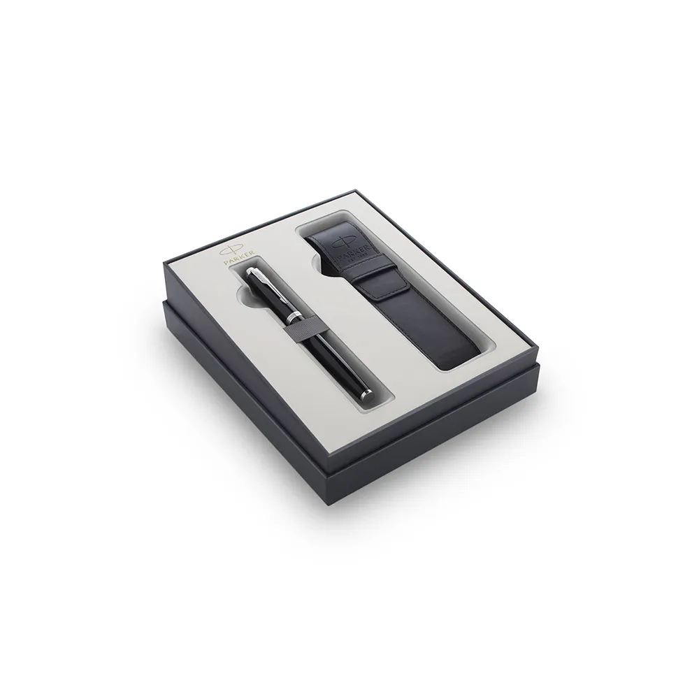 Pióro wieczne i dopasowane czarne etui z PU na pióro, zapakowane w klasyczne pudełko upominkowe Parker. . Każde opakowanie prezentowe, odzwierciedlające tożsamość marki, zostało zaprojektowane z pasją i przyciąga wzrok wyjątkowymi zdobieniami. . Produkty zostały specjalnie dobrane tak, aby stworzyć prezent idealny na każdą okazję. . Zestaw ten zawiera eleganckie etui z logo Parker, które pozwala piszącemu zabrać pióro wieczne ze sobą. . Idealny upominek na każdą okazję.. Nowa kolekcja upominków przywodzi na myśli luksus i elegancję. Każde opakowanie prezentowe, odzwierciedlające tożsamość marki, zostało zaprojektowane z pasją i przyciąga wzrok wyjątkowymi zdobieniami.