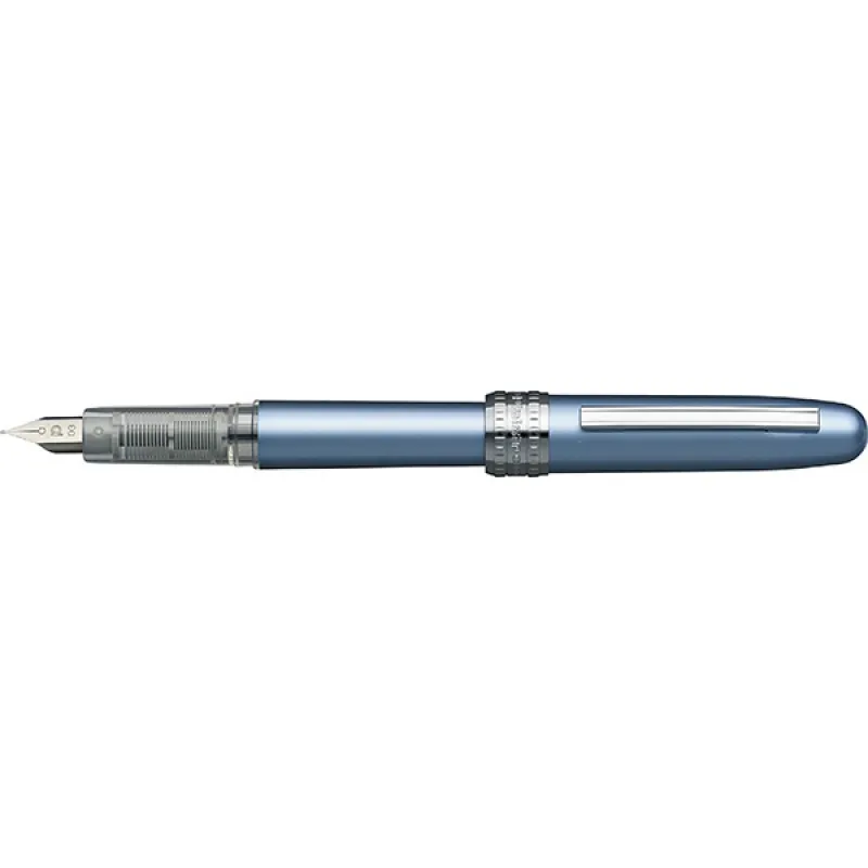 Pióro wieczne Platinum Plaisir Frosty Blue, F, niebieskie metaliczne. Pióro wieczne japońskiej marki Platinum z kolekcji Plaisir, skuwka z systemem „Slip & Seal”, która zapobiega wysychaniu atramentu, umożliwiając płynne pisanie nawet po nieużywaniu pióra wiecznego przez cały rok. Korpus wykonany z aluminium w niebieskim, metalicznym kolorze, stalówka wykonana ze stali nierdzewnej, posiada nabój atramentowy Platinum na start, pakowane w firmowe opakowanie, kolor: niebieskie metaliczne.