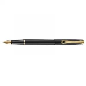 Pióro wieczne DIPLOMAT Traveller czarne/złote F. Opis produktu: pióro wieczne niemieckiej marki DIPLOMAT z kolekcji Traveller, kolor czarny ze złotymi wykończeniami, elegancka, smukła budowa, ponadczasowe wzornictwo, korpus w całości metalowy, pokryty lakierem w czarnym, błyszczącym kolorze, łatwy chwyt, gładka niczym atłas i niezwykle trwała powłoka, klips skuwki i pierścienie są pozłacane, wyposażone w nowy system…