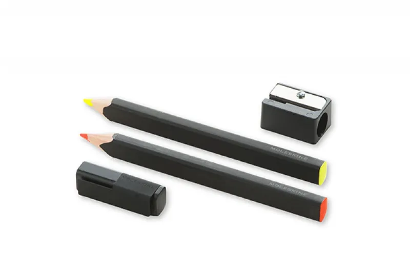 Dwa ołówki – zakreślacze Moleskine wykonane z drewna lipowego. Kolorowy, fluorescencyjny grafit w kolorze pomarańczowym i żółtym. Specjalna nasadka z klipsem umożliwia przyczepienie do okładki notesu. Temperówka w komplecie idealnie nadaje się do ostrzenia ołówków Moleskine wykonana z plastiku ABS w matowym czarnym wykończeniu idealnie pasującym do pozostałych produktów. Wysokiej jakości niemieckie ostrze. Średnica otworu 12,5 mm